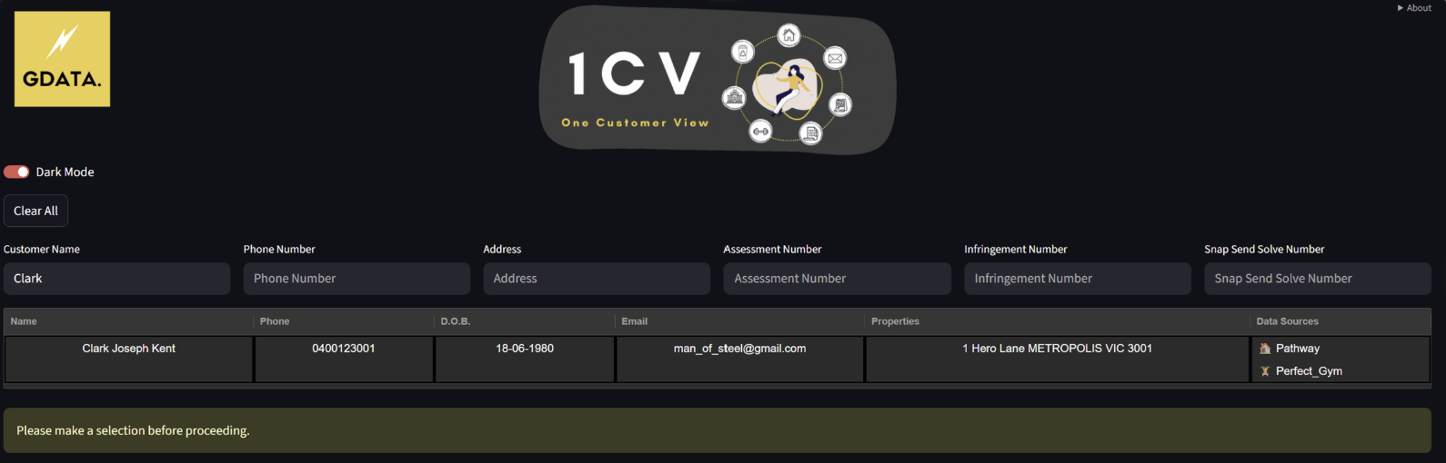 Once a search is executed, One Customer View displays all matching records with key identifying details to assist in locating the correct customer.