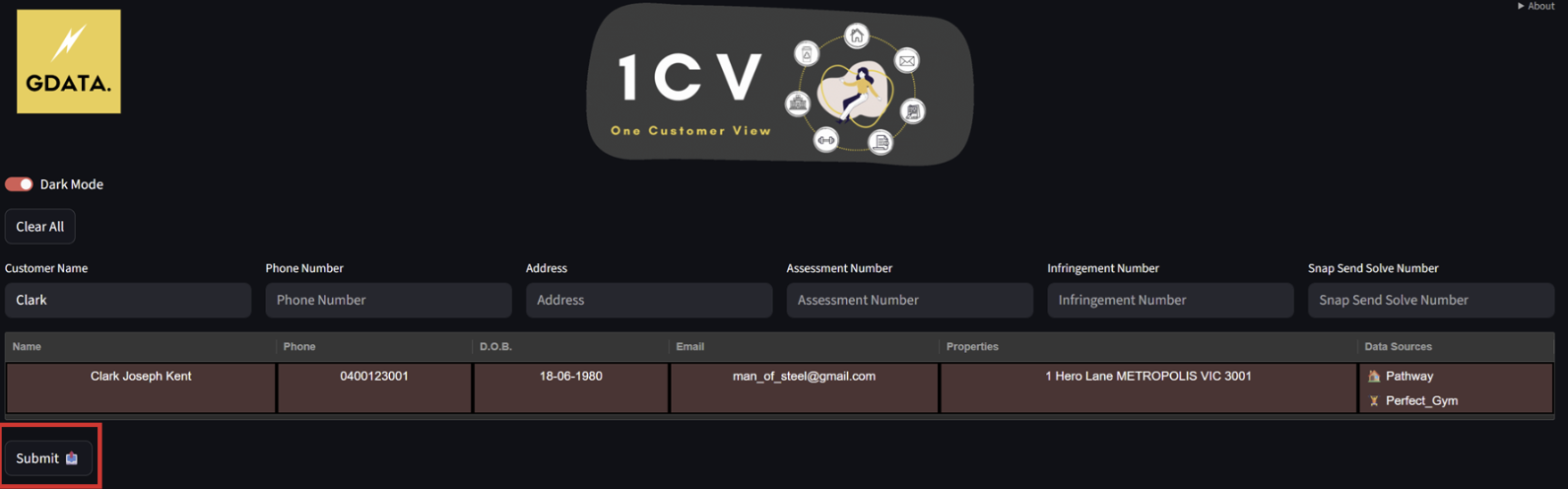 By consolidating this data, One Customer View provides a unified profile that eliminates duplication and enhances clarity. After identifying the appropriate record, select it and click Submit to load the full customer profile.
