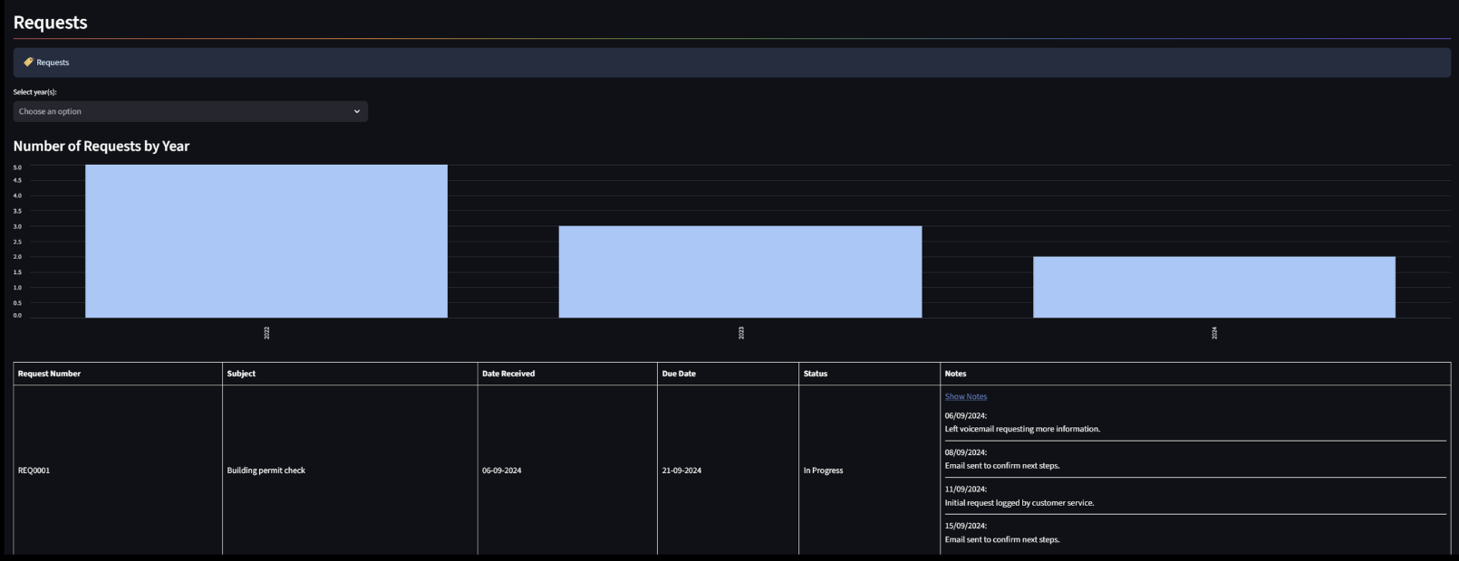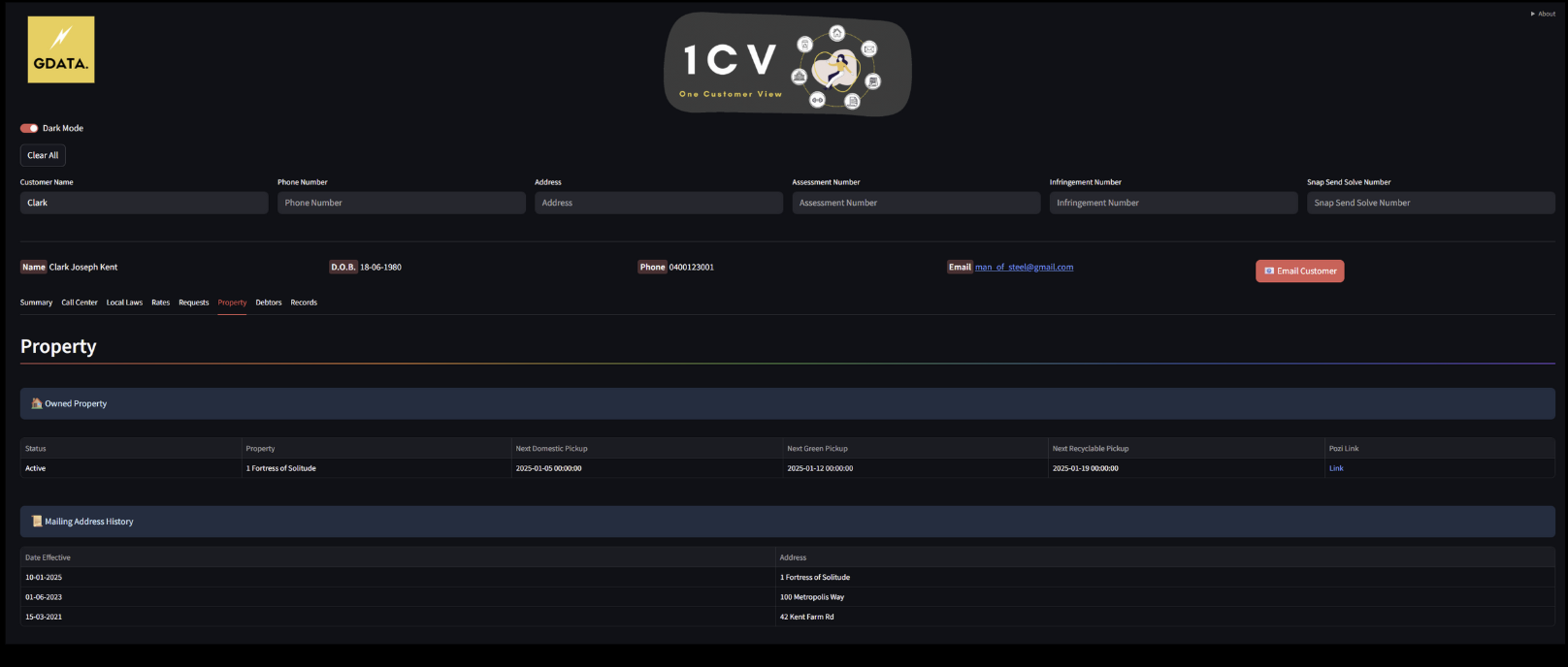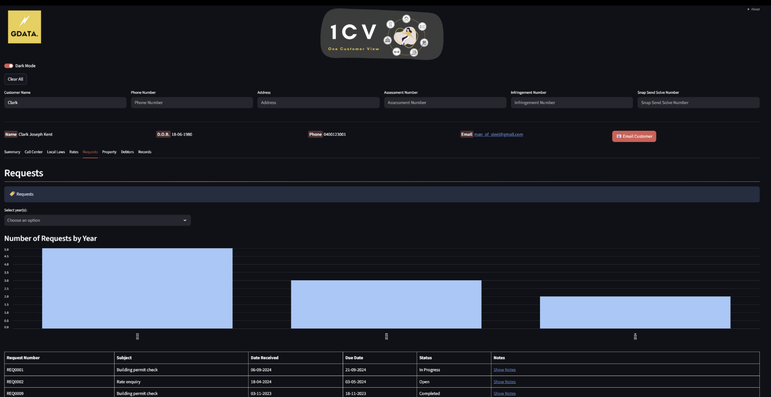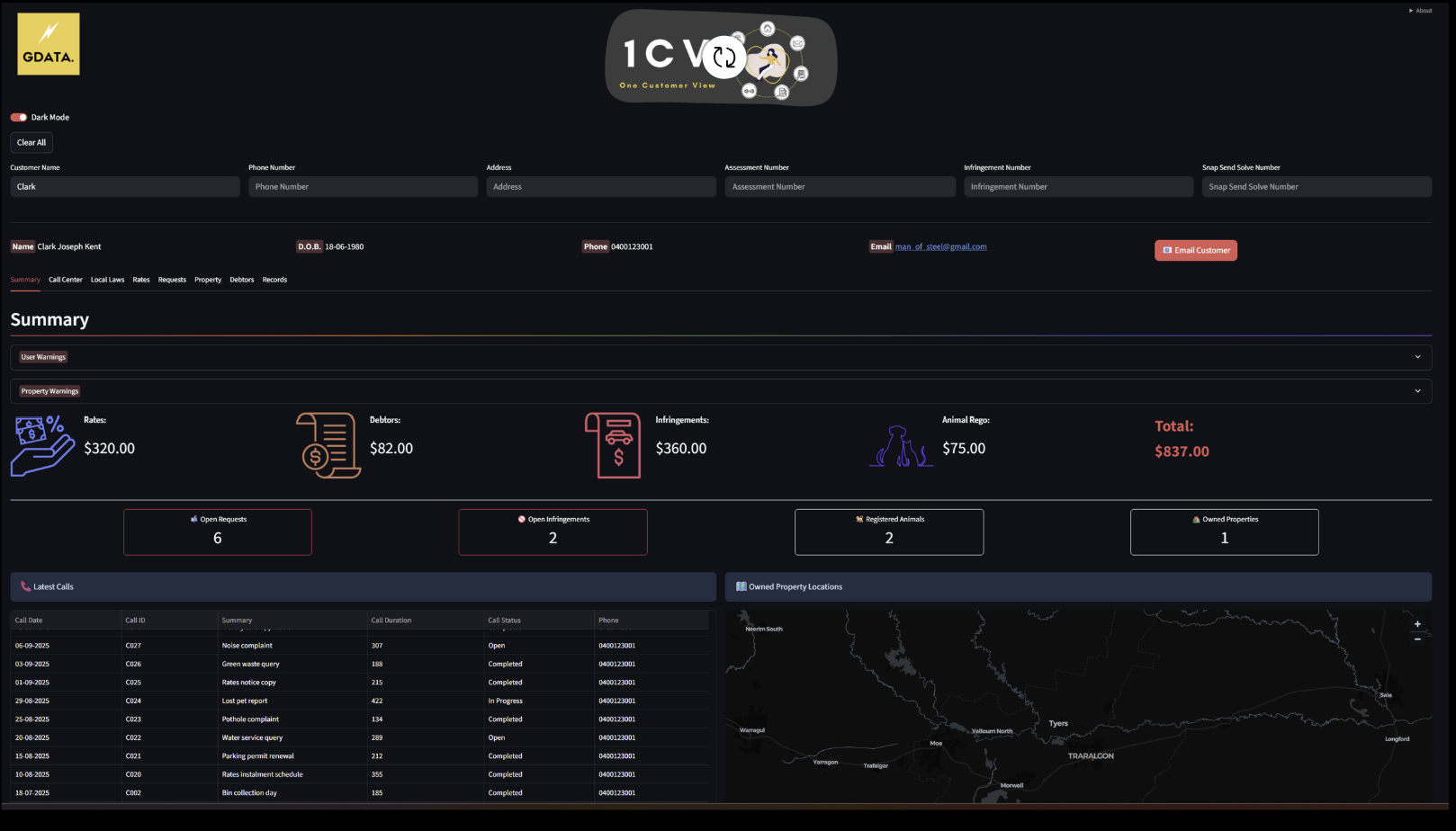The Summary Page provides a comprehensive overview of the customer’s relationship with Council. It is designed to deliver key insights at a glance and serves as the main reference point for understanding customer interactions.