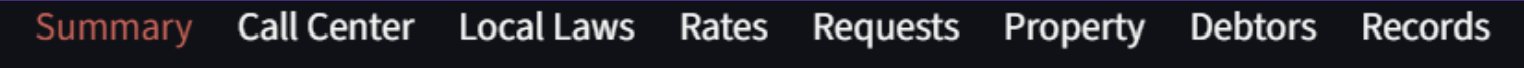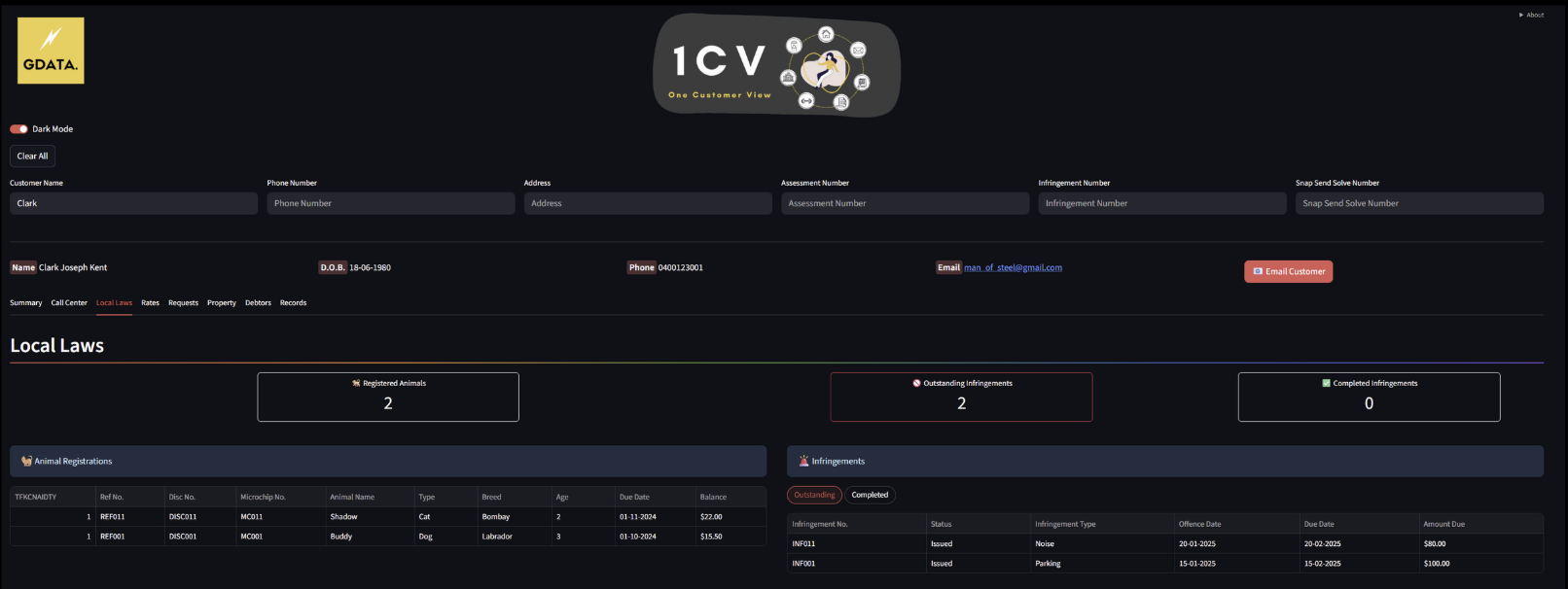 Council Interactions Overview: Summarises key information such as Rates, Debtors, Infringements, and Animal Registrations.