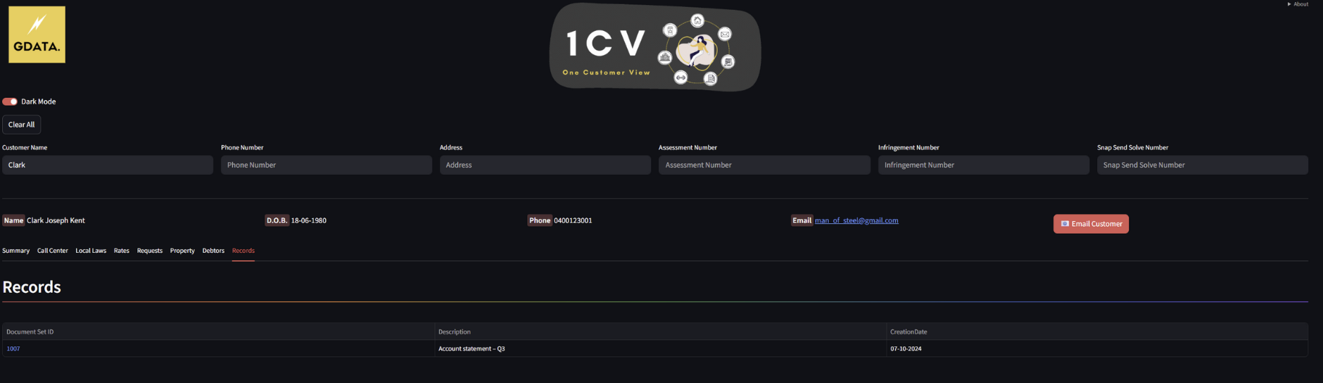 The Records page displays all documents linked to the customer, sourced from the Council’s document management systems such as ECM (Tech1).